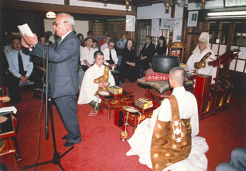 慰霊法要の様子。全国ソロモン会、安田会長による追悼文読み上げ。 今回ご縁を頂き、当慰霊法要にて皆々様から感じましたことは、終戦後64年が経過したにもかかわらず、戦没者、犠牲者の方々への真摯なご供養のお気持ちが大変深いということです。区別する訳ではありませんが、通常の法要とは異なった厳粛なる法要を勤めさせて頂くことが出来ました。法要後の昼食時には、当時を偲ぶお話を皆様めいめいでされていました。当山は日蓮宗ですので、この宗派に則した三僧による法要形式ではありましたが、所謂、宗旨宗派を越えて、只一心に成仏を念ずる皆様お一人お一人のお焼香と合掌姿が大変印象的でありました。