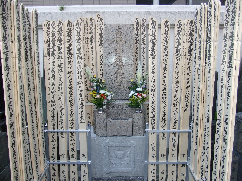 寿仙院境内の宝塔に上げられたお塔婆の数々。ご供養された部隊や故人の方の名前が見てとれます。靖国神社での慰霊祭をはじめ、様々なご供養の仕方がありますが、仏式による今回の法要では、ご回向(えこう)と申しまして、より丁寧に、すなわち戦没年月日、戦没地、部隊名、階級、俗名、戒名等を、導師たる私がお読み上げし、ご本尊の御前にご来臨を請い奉り、あなた様のために、今こうして塔を建てて供養しますよ、と云う法華経の教えに沿ったお塔婆供養を致しました。勿論、通常のご供養では、亡くなった場所や、所属などは申し上げません。しかしながら、如何せん、お亡くなりになった想いや状況が、通常の場合と大変異なりますので、敢えて私は、かようなご回向を申し上げて、少しでもその英霊や犠牲者の諸霊位に近い情況、気持ちになってこそ、魂と魂が通じ合い、慰霊の誠を捧げられるものであると、自身の体験を通しまして皆様に申し上げたいのです。今回一様にご参列の皆々様からは、「こんなに丁寧なご供養をして頂けるとは思いませんでした」、「また来年も是非」等々のお声を頂きました。私も今後とも、一僧侶として、一日本人として、また近現代史研究会会員の一員として、成せるべきことを積極的にして参りたいと思う次第です。近々、境内に慰霊碑も建立し、来年もこの慰霊法要を営む予定です。是非、ご参列賜り、更なる英霊並びに犠牲者の諸霊位へのご供養を、ご一緒にお勤め頂ければと存じます。